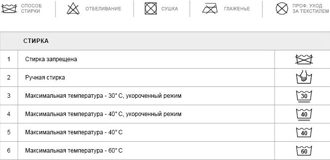 В России действует маркировка ухода за текстильными изделиями, которая узаконена в документе ГОСТ 16958-71. Настоящий стандарт устанавливает условные графические обозначения и их значение для ухода за текстильными изделиями.