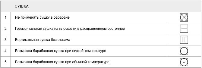 Вся система состоит из знаков: стирка, отбеливание, глажение, химчистка, машинная сушка.