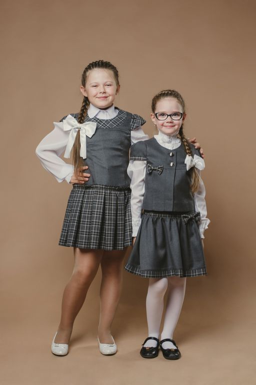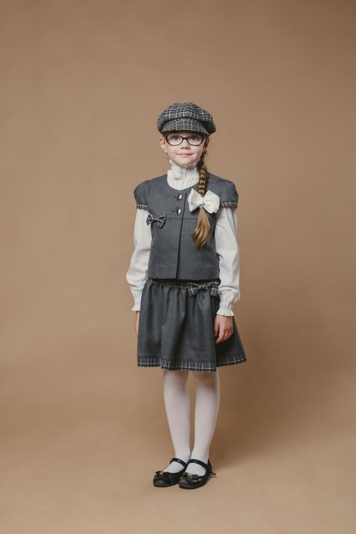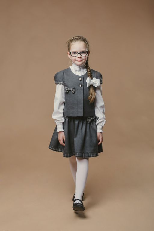 Костюм для девочки младшей и средней школьной возрастной группы из п/ш ткани, состоящего из жилета и юбки, выполненных из тканей компаньонов.