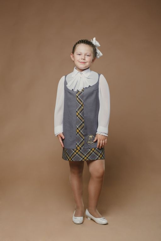 Сарафан прямого силуэта. Верхняя часть сарафана с застёжкой в среднем шве спинки на навесную петлю и пуговицу. Низ сарафана и вертикальная вставка полочки из ткани в клетку. В левой нижней части сарафана, над отделочной деталью из ткани компаньона, выполнена вышивка-эмблема.
