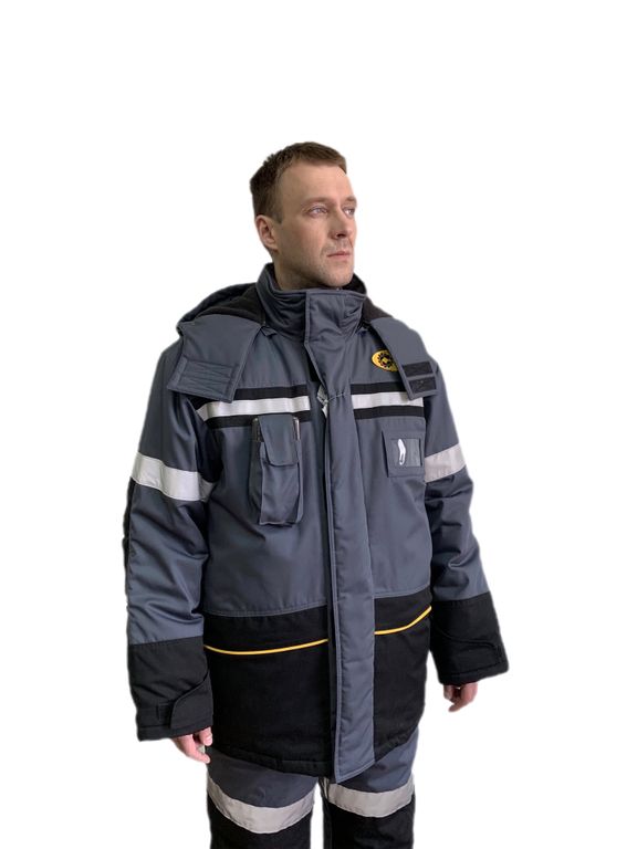 Костюм серого цвета с деталями желтого и черного цвета, со световозвращающими полосами серебристого цвета. Куртка укороченная, с пристегивающейся теплозащитной подкладкой, с притачным поясом, центральной застежкой-молнией, закрытой планкой с текстильной застежкой, воротником-стойкой, втачными рукавами, съемным капюшоном, вентиляционным капюшоном, вентиляционными отверстиями в виде люверсов в области проймы. Полукомбинезон с застежкой-молнией в среднем шве передних половинок брюк, застежкой на пуговицах в боковых швах, притачными нагрудником и спинкой, бретелями. Бретели с участком из ленты эластичной и застежкой - карабина.
