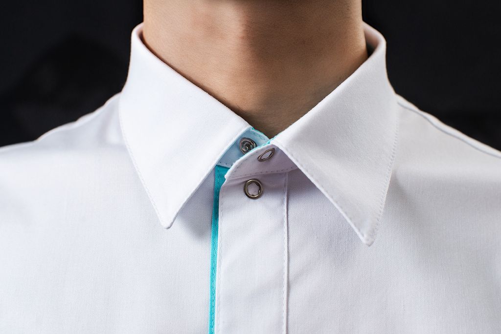 Воротник – стояче-отложной с отрезной стойкой, застёгивается на кнопку. Стойка верхнего воротника – из отделочной ткани. В нижней части боковых швов - разрезы.