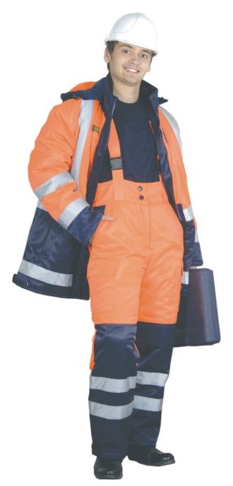 Брюки с широким притачным поясом; с пятью шлевками, переходящими на передних половинках в держатели фастексов. Застежка в среднем шве на тесьму-молнию, пояс застегивается на две петли и на две пуговицы. Отрезные бочки передних половинок, нижние части передних и задних половинок из отделочной ткани. По низу брюк проходит два ряда световозвращающей тесьмы.