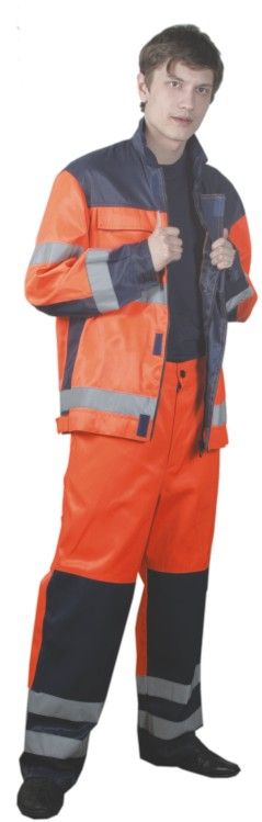 Брюки прямые с притачным поясом, стянутым сзади эластичной тесьмой с пятью шлевками. Застежка в среднем шве на тесьму- молнию, пояс застегивается на пуговицу. Передние половинки с защипами, с карманом в отрезном бочке, с наколенниками из отделочной ткани. Задние половинки с накладными карманами. Защитные свойства: МиЗ, СО, класс защиты 3. Рекомендуемое сырье: полиэфирнохлопковая ткань с ВО пропиткой