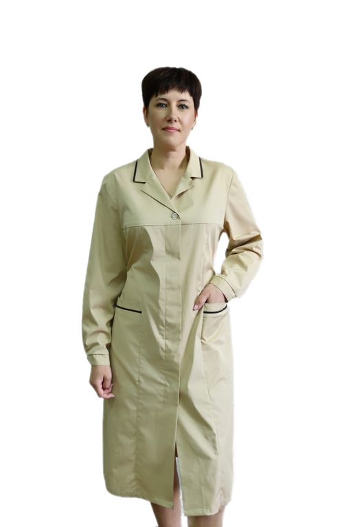 Халат женский полуприлегающего силуэта с центральной бортовой застежкой на пуговицы. Полочки с рельефами от плечевых швов до низа, с двумя боковыми накладными карманами, срезы карманов входят в боковые и рельефные швы. Верхний край кармана с притачной планкой. Спинка со средним швом, плечевыми вытачками и полупоясами. Средний шов заканчивается шлицей. Воротник втачной, стояче-отложной с лацканами.